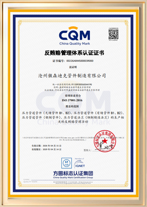 在 傲森迪克,我们提供各种高品质管件和法兰,包括弯头、三通、异径管、弯管、管帽和法兰。我们的产品符合 ASTM、ANSI、JIS、DIN 和 GB 等国际标准,确保卓越的性能、可靠性和安全性。我们以提供具有竞争力的价格且经济高效的解决方案而自豪,这使我们成为各行各业的理想选择。